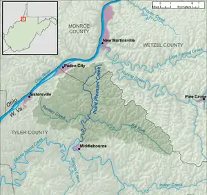 Point Pleasant Creek is a tributary of Middle Island Creek, 10.4 miles (16.7 km) long,[3] in northwestern West Virginia in the United States. Via Middle Island Creek and the Ohio River, it is part of the watershed of the Mississippi River, draining an area of 60.5 square miles (157 km2)[4] in a rural region on the unglaciated portion of the Allegheny Plateau.