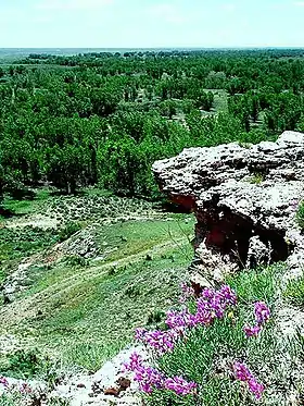The bluff overlooks the north side of the Cimarron River and lies approximately seven miles north of Elkhart west of K-27.[2] Point of Rocks has been an important landmark for travelers to this region of Kansas. It signifies the closeness of springs and thus water. Many springs are known to exist in the region of the Cimarron River near Point of Rocks. Because of this, Point of Rocks was an important landmark for travelers heading west on the Cimarron Cutoff and for modern day ranchers. Point of Rocks is the third Highest Point in the state of Kansas with the elevation at its summit being 3,540 feet (1,080 m).[1]