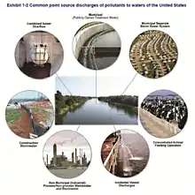 A point source of pollution is a single identifiable source of air, water, thermal, noise or light pollution. A point source has negligible extent, distinguishing it from other pollution source geometries (such as nonpoint source or area source). The sources are called point sources because in mathematical modeling, they can be approximated as a mathematical point to simplify analysis.[1] Pollution point sources are identical to other physics, engineering, optics, and chemistry point sources and include: