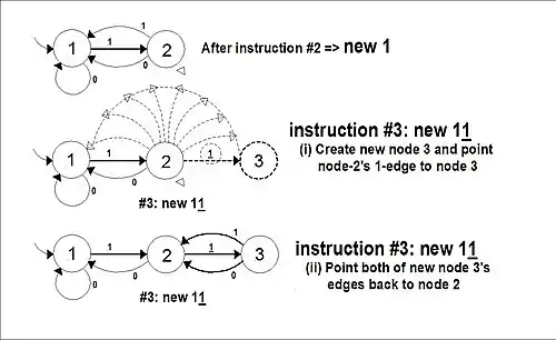 (1) new w: creates a new node. w represents the new word that creates the new node. The machine reads the word w, following the path represented by the symbols of w until the machine comes to the last, "additional" symbol in the word. The additional symbol instead forces the last state to create a new node, and "flip" its corresponding arrow (the one labelled with that symbol) from its old position to point to the new node. The new node in turn points all its edges back to the old last-state, where they just "rest" until redirected by another new or set. In a sense the new nodes are "sleeping", waiting for an assignment. In the case of the starting or center node we likewise would begin with both of its edges pointing back to itself.