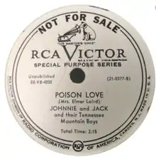 "Poison Love" is a country music song written by Tillman Franks and Elmer Laird, but credited to Laird's widow.[1] It was recorded by Johnnie & Jack, and released on the RCA Victor label. In January 1951, it reached No. 4 on the country charts.[2] It spent 17 weeks on the charts and was the No. 16 best selling country record of 1951.[3][2] Franks helped Laird write the song and pitched it to Eddy Arnold, who declined to record it. His friends Johnnie & Jack recorded it, and it became their first hit. Franks gave the entire copyright to the widow of Elmer Laird, a Shreveport automobile dealer who had once employed him.[4]