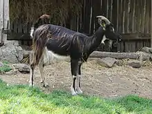 The Poitou goat (French: Chèvre Poitevine) is a dairy goat breed from western France. With a history dating back to 1800,[1] the breed is named for the Poitou historic province. Poitou goats are known for their use in goat milk cheese production,[2] though they are an endangered breed,[3] and at one point were down to just 600 breeding animals.[4] Poitou goats have a distinctive appearance: tall and with long, shaggy hair, they are black-brown with white marks on the head and neck, while the underbelly and legs are white.[5][6]