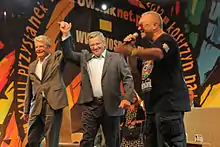 The festival was initiated in 1994 by Jerzy Owsiak after his trip to the United States where he attended the Woodstock Festival, which was held after a 25-year hiatus.[8] The festival's official motto is Love, Friendship, Music.[9] The event is held by the Great Orchestra of Christmas Charity as a way of thanking its volunteers. Generally a weekend-long event, its two stages are in continuous use from early afternoon to dawn, featuring performances by around 30 bands every year. Many Polish musicians and bands have made several appearances, including IRA, Decapitated, Myslovitz, Maria Peszek, Kamil Bednarek, Dżem, Acid Drinkers, Lessdress, Hey and Riverside. International bands are also invited every year – Skunk Anansie, Sabaton, Judas Priest, Within Temptation, Shaggy, The Stranglers, Papa Roach, The Prodigy, Kaiser Chiefs, Ugly Kid Joe, You Me at Six, Guano Apes, Kontrust, Clawfinger, Nigel Kennedy, Gentleman, Korpiklaani among many others.[10] Festival promoters also aim to promote emerging talent – and a competition is held prior to the festival, and the winners are given a chance to perform at the festival. The main musical theme is generally rock, but genres range from folk through experimental to metal. Recent years has also seen reggae, electronic music and even classical music represented.[11][12][13]