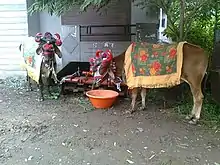Homes in the village are decorated with rangolis and toran on top of doors. Puja thalis with kumkum, water, and sweets are prepared, and when the cattle is returned from the procession they are formally greeted by family members, with an earthen lamp with ghee for puja and aarti.[2]