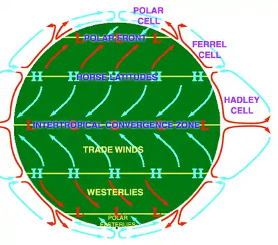 The polar front theory says that mid-latitude extratropical cyclones form on boundaries between warm and cold air.[3] In winter, the polar front shifts towards the Equator, whereas high pressure systems dominate more in the summer.