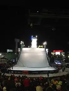 According to Eric Webster, the spokesman from the US Ski & Snowboard Association, "The structure itself, when completed, will stretch from the outfield all the way to home plate, basically."[4] The structure stood above the lights as the tallest object within the arena. Competitors had to climb several flights of stairs or ride an industrial elevator to reach the top of the jump.[5] The jump, when completed, was approximately 140 feet high, 430 feet long, and set at a 38 degree incline. Riders were able to reach speeds up to 40 miles per hour and needed to use that momentum to clear the 70 foot gap between the takeoff and landing.[2]