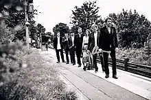 The band was formed by vocalist James Studholme and fiddle player Eddie Bishop, who were joined by mandolin player Tim Jepson and guitarist Pete Robinson for the band's first gig.[1] By the time of the band's first recording session in 2009, drummer Michael Giri, formerly of The Lilac Time,[2] and banjo player Tim Dowling had been added to the line-up.[1][3] The seventh member to join was bass guitarist Adam Bennette.[1] Robinson and Bennette left the band after the recording of the Westward Ho! album. Bennette was replaced by Don Bowen (bass), and trumpeter Emily Norris also joined the band. In 2014 Shahen Galichian (piano, keyboards, accordion), formerly of the Golden Manor Medicine Show, joined the line-up.