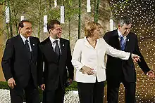 Berlusconi and his cabinets have had a strong tendency to support American foreign policies,[20] despite the policy divide between the U.S. and many founding members of the European Union (Germany, France, Belgium) during the Bush administration.[21] Under his lead the Italian Government also shifted its traditional position on foreign policy from being the most pro-Arab western government towards a greater friendship with Israel and Turkey (Silvio Berlusconi acted as wedding witness for the son of the Turkish Prime Minister Recep Tayyip Erdoğan)[22] than in the past, hence rebalancing relations with all the Mediterranean countries to reach equal closeness with them. Berlusconi is one of the strongest supporters of Turkey's application to accede to the European Union.[23] In order to support Turkey's application the Italian Premier invited Prime Minister Erdoğan to take part in a meeting of the European leaders of Denmark, France, Germany, the Netherlands, Spain, Sweden, and the United Kingdom, gathered in L'Aquila for the 2009 G8 summit.[24][25] Italy, with Berlusconi in office, became a solid ally of the United States due to his support in deploying Italian troops in the War in Afghanistan and the Iraq War following the 2003 invasion of Iraq in the War on Terror.