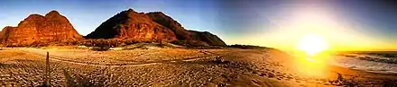 The park is located at the western end of Kauai and has many miles of shoreline that averages about 300 feet from the barrier dunes to the surf line. Sand dunes along the beach can reach heights nearing 100 feet. Driving on the beach is no longer permitted.< https://dlnr.hawaii.gov/dsp/parks/kauai/polihale-state-park/> The only road to the park is dirt, with many ruts and potholes, and is difficult to access by non-4WD vehicles. The park is located to the north of the Pacific Missile Range Facility and Barking Sands beach. The beach is flanked to the north by the Na Pali Coast mountain ridges. On the east side park is adjacent to the field used for agriculture, that is in turn adjacent to the mountain ridge. Mountains are so close that at night park visitors can hear goats bleating on this ridge. Road access is west from the town of Kekaha. A good local map will be needed.