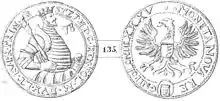 The first form of tangible currency in Poland was the denarius (denar), which circulated since the 10th century.[11] During this period, Polish coinage had a single face value and was minted from bullion, primarily silver, but also compounded with copper and other precious metals.[12] The standard unit of mass used at the time was the grzywna rather than the pound, with one grzywna being equivalent to 240 denars.[13] From the 1300s to the mid-16th century, the Prague groschen (or groat) dominated the market and its high supply reduced the demand for a national currency across Central Europe.[14] Certain cities and autonomous regions of the Polish Kingdom held the privilege of minting its own currency, for instance the shilling (szeląg) in the Duchy of Prussia, which Poland co-adopted in 1526.[15]