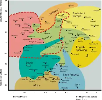 In its 4 January 2003 issue, The Economist discussed a chart,[35] proposed by Ronald Inglehart and supported by the World Values Survey (associated with the University of Michigan), to plot cultural ideology onto two dimensions. On the y-axis it covered issues of tradition and religion, like patriotism, abortion, euthanasia and the importance of obeying the law and authority figures. At the bottom of the chart is the traditionalist position on issues like these (with loyalty to country and family and respect for life considered important), while at the top is the secular position. The x-axis deals with self-expression, issues like everyday conduct and dress, acceptance of diversity (including foreigners) and innovation, and attitudes towards people with specific controversial lifestyles such as vegetarianism, as well as willingness to engage in political activism. At the right of the chart is the open self-expressionist position, while at the left is its opposite position, which Inglehart calls survivalist. This chart not only has the power to map the values of individuals, but also to compare the values of people in different countries. Placed on this chart, European Union countries in continental Europe come out on the top right, Anglophone countries on the middle right, Latin American countries on the bottom right, African, Middle Eastern and South Asian countries on the bottom left and ex-Communist countries on the top left.