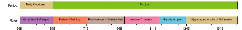 The political history of medieval Karnataka spans the 4th to the 16th centuries, when the empires that evolved in the Karnataka region of India made a lasting impact on the subcontinent. Before this, alien empires held sway over the region, and the nucleus of power was outside modern Karnataka. The medieval era can be broadly divided into several periods: The earliest native kingdoms and imperialism; the successful domination of the Gangetic plains in northern India and rivalry with the empires of Tamilakam over the Vengi region; and the domination of the southern Deccan and consolidation against Muslim invasion. The origins of the rise of the Karnataka region as an independent power date back to the fourth-century birth of the Kadamba Dynasty of Banavasi, the earliest of the native rulers to conduct administration in the native language of Kannada in addition to the official Sanskrit. This is the historical starting point in studying the development of the region as an enduring geopolitical entity and of Kannada as an important regional language.