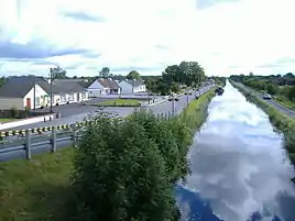 The canal runs from Dublin to Shannon Harbour in Offaly. The stretch of the canal that Pollagh is on was opened in 1804.[6] The canal is separated by locks, allowing for a drop in height of the surrounding land. Pollagh is built on the longest stretch between locks on the canal. The canal divides Pollagh in two, and the Plunkett Bridge, built in 1809,[7] is the only bridge in the nearby area that allows for passage across the canal. It is peculiar in shape, resembling an 'n', meaning the a driver must make two sharp turns at the peak of the bridge.