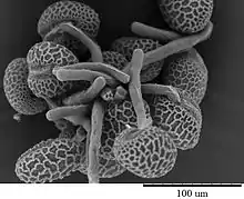There is great variation in the rate of growth of pollen tubes and many studies have focused on signaling.[15] The gene expression in the pollen grain has been identified as that of the gametophyte and not of the parental sporophyte, as it expresses its own unique mRNA and enzymes.[15] In the peach tree, the style environment which the pollen tube grows through provides nutrition for the tube's growth to the ovule.[14] Pollen tubes are tolerant and even pollen damaged by X-rays and gamma rays can still grow pollen tubes.[15]