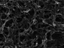 Polyaniline nanofibers are a high aspect form of polyaniline, a polymer consisting of aniline monomers, which appears as discrete long threads with an average diameter between 30 nm and 100 nm. Polyaniline is one of the oldest known conducting polymers, being known for over 150 years.[2] Polyaniline nanofibers are often studied for their potential to enhance the properties of polyaniline or have additional beneficial properties due to the addition of a nanostructure to the polymer.[2] Properties that make polyaniline useful can be seen in the nanofiber form as well, such as facile synthesis, environmental stability, and simple acid/base doping/dedoping chemistry. These and other properties have led to the formation of various applications for polyaniline nanofibers as actuators, memory devices, and sensors.