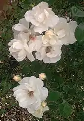 Although they arose too late to qualify technically as old garden roses, the hybrid musks are often informally classed with them, since their growth habits and care are much more like the old garden roses than modern roses. The hybrid musk group was mainly developed by Rev. Joseph Pemberton, a British rosarian, in the first decades of the 20th century, based upon 'Aglaia', an 1896 cross by Peter Lambert. A seedling of this rose, 'Trier', is considered to the foundation of the class.[14] The genetics of the class are somewhat obscure, as some of the parents are unknown. Rosa multiflora, however, is known to be one parent, and Rosa moschata (the musk rose) also figures in its heritage, though it is considered to be less important than the name would suggest. Hybrid musks are disease-resistant, repeat flowering and generally cluster-flowered, with a strong, characteristic "musk" scent.[34] The stems tend to be lax and arching, with limited thorns.[22] Examples include 'Buff Beauty' and 'Penelope'.