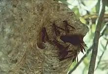 Workers build enclosed, multitiered, roughly spherical nests of carton paper maché-like pulp of plant fibres chewed with saliva.[1] Nests are reddish-brown in color, and are not very large.[2] They are typically built between 2 and 5 m off the ground,[7] in the branches of trees or shrubs.[1]