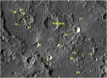 By convention these features are identified on lunar maps by placing the letter on the side of the crater midpoint that is closest to Polybius.
