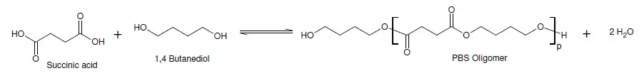 The direct esterification of succinic acid with 1,4-butanediol is the most common way to produce PBS. It consists of a two step process. First, an excess of the diol is esterified with the diacid to form PBS oligomers with elimination of water.