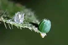 Females lay their eggs on a variety of host plants, preferring those that minimize larval development time. Unlike some butterflies who lay their eggs in batches, comma females often lay their eggs singly.[16] After each egg is laid, the female scouts out other possible host plants before determining the site of her next egg.[5] The eggs are green when first laid, and gradually turn yellow and ultimately grey before hatching,[2] which generally takes four to five days.[17] Although the female can allocate more resources into egg production based on the nuptial gifts received by mates, the total number of eggs laid or the mass of the eggs are altered based on the host plant. A lack of correlation suggests that neither egg quantity nor egg mass indicate future fitness for the offspring.[12]