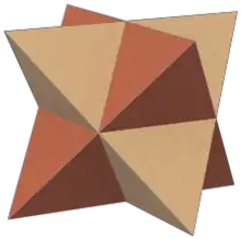 Best known is the regular compound of two tetrahedra, often called the stella octangula, a name given to it by Kepler. The vertices of the two tetrahedra define a cube, and the intersection of the two define a regular octahedron, which shares the same face-planes as the compound. Thus the compound of two tetrahedra is a stellation of the octahedron, and in fact, the only finite stellation thereof.