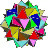 The regular compound of five tetrahedra comes in two enantiomorphic versions, which together make up the regular compound of ten tetrahedra.[1] The regular compound of ten tetrahedra can also be constructed with five Stellae octangulae.[1]