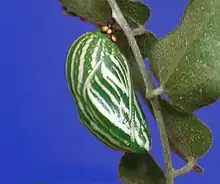 "Elongated, slug-shaped, dark green; head large, wide and surmounted by four divergent curved fleshy spinous processes; anal segment with two short naked terminal points; the segments with an oblique yellowish-white lateral stripe, most prominent on the 7th, 9th and 11th segments, and beneath these a lower series of small white spots." (Moore.)[4] The caterpillars are popularly known as "Dragon-headed Caterpillars" because of the shape of the "horns".[10]
