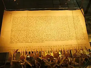 The towns Stettin, Greifenhagen, and Gollnow in Pomerania-Stettin, concerned about a permanent division of the duchy in case Barnim III would not have children, rebelled in 1339 and sided with Pomerania-Wolgast in 1341.[20] Barnim had to move his court to Gartz (Oder). On 12 June 1348 German king and later emperor Karl IV granted the Duchy of Pomerania as a whole and the Rugian principality as a fief to the dukes of both Pomerania-Stettin and Pomerania-Wolgast, erasing Brandenburg's claims. The Pomeranian dukes and towns reconciled in 1344/54.[21]