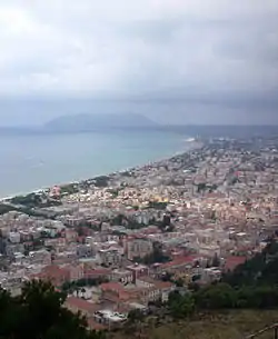 The rift valley remained a depression in the Tyrrhenian Sea for about two million years and then in the Tuscolano-Artemisio phase, dated 600–360 thousand years BP, a series of volcanic changes began leading to the current land form: the first four eruptive cycles of a new volcano in the vicinity of the Monti Albani, which spread pyroclastic rock and formed a caldera.[6] In the Campi di Annibale phase, 300-200 thousand years BP, a stratovolcano formed in the caldera. Approximately contemporaneously, in the Middle Pleistocene, 781-126 thousand years BP, beds of sand and clay, termed the Latina Complex, appeared above sea level over the outer karst, enclosing a lagoon.[7] The beaches survive as the Latina Level from about 560 thousand years BP.