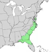 Pinus serotina, the pond pine, marsh pine or pocosin pine, is a pine tree found along the Southeastern portion of the Atlantic coastal plain of the United States, from southern New Jersey south to Florida and west to southern Alabama. This pine often has a crooked growth pattern and an irregular top and grows up to 21 metres (69 ft) high,[2] rarely to 29 metres (95 ft).[3]