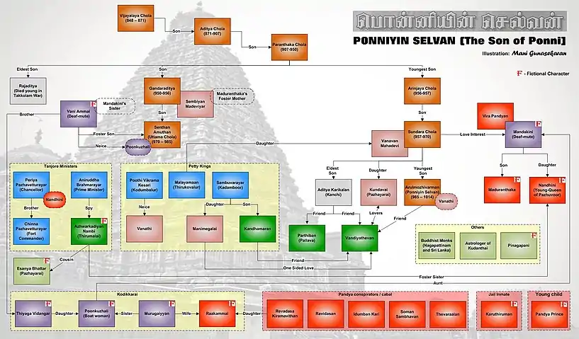 - Arulmozhivarman/ Ponniyin Selvan later known as Rajaraja I: The titular protagonist. The youngest son of Sundara Chola. He was raised in Pazhayarai by Periya Piratti and Ilaya Piratti. He was taught well by his sister and was sent to Sri Lanka at the age of 19 for battle. He was said to be saved by Mother Kaveri herself from drowning in the river when he was 5, earning him the title "Ponniyin Selvan" ("Son of Kaveri").