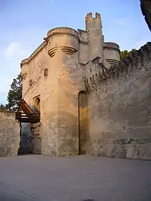 The bridge had great strategic importance as when first built it was the only fixed river crossing between Lyon and the Mediterranean Sea. It was also the only river crossing between the Comtat Venaissin, an enclave controlled by the Pope, and France proper under the authority of the kings of France. As such, it was closely guarded on both sides of the river. The right bank, which was controlled by the French crown, was overlooked by the fortress of the Tour Philippe-le-Bel which was built at the beginning of the 14th century.[29] On the Avignon side, a large gatehouse was erected in the 14th century and then extensively modified in the 15th century. The walkway passed over the city wall and down a ramp (now destroyed) which led into the city.[30]