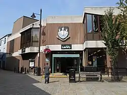 The present library was is situated on Shoemarket and was opened in 1975 to a design by disgraced Pontefract architect, John Poulson.[3] The library was one of Poulson's final buildings, opening two years after his imprisonment for corruption. The building is of two storeys, the first floor being a mezzanine. The interior is clad in wood with a central staircase linking the ground floor with the mezzanine. The ceiling has square skylights situated over the central atrium. The exterior has the characteristic geometric shapes of Poulson's earlier brutalist style buildings, however unlike his earlier works the pre-cast concrete is finished. The windows are tinted to protect the stock and extrude from the building. The library is the only public library in the town.