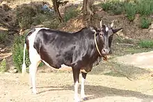 Ponwar is an indigenous cattle breed of India.[1] It is known to be originated at Ponwar in Puranpur Taluk in Pilibhit district of Uttar Pradesh state and the breed is named after the same place.[2] The cattle is also restricted to the small geographic area[3] adjoining Ponwar. The cattle are known to be very active and are of fiery disposition. They exhibit dual coloured complexion of black and white. It is a draught breed and is mainly used for cart pulling.[4]The breeding tract lies between latitude 28°4’ and 28°8’ North and between longitude 79°0’ and 80°4’ East.The tail switch is white in black animals and black in those having a greater proportion of white patches. The body is small, compact and non-fleshy, the face is small and narrow and the ears are small. The horns are small to medium and curve inward with pointed tips. The hump is small in females and developed in males. The tail is long and reaches to below the hock. Cows have small udders and teats. The animals of this breed possess an aggressive temperament.