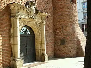 The monastery and its church had at this time a strategic location, on the road from the Carmelite monastery (now gone) in the North continuing to the bridge leading to the Old City of Bydgoszcz. This fact explained that around 1740, a multi storey tower topped with a baroque spire has been erected in the south-west corner of the nave.[5] Slits on the lower levels were adjusted to allow the use of firearms.