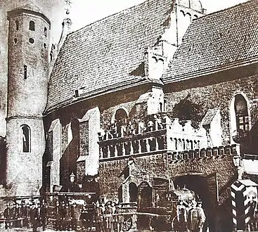 The secularised building of the church was used for diverse purposes. Initially city authorities installed there the municipal scales. Then an alcoholic beverages store was installed: part of the western chancel (with the former gallery) was isolated and refitted, an opening was made through the southern wall for the warehouse.[6]