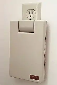 The X100—the flagship product in the Popcom range—is an external modem, housed in a beige[4] plastic case with a built-in AC power adapter.[5] Its two-pronged (non-polarized) plug is molded into a swiveled hinge, allowing it to hug the wall when the modem is plugged directly into a wall socket (the prongs perpendicular to the socket and the rest of the unit parallel) or be plugged into a power strip (the entire unit perpendicular to the strip).[6] The three communications ports of the X100 include the RS-232 serial port (a female DB-25 connector), a modular 6P6C port for telephone handsets, and a modular 8P8C port that connects the X100 to the wall phone jack. The communications ports are located opposite the AC plug, or at the base of the modem when the modem is plugged into the wall.[7] The X100 measures 7.8 by 4.7 by 1.6 inches (19.8 by 11.9 by 4.1 cm)—not including the plug, which contributes to 0.7 in to either the length or depth, depending on the direction it faces.[7] The plug cannot fold down into the unit.[8] A dimple in what is normally the rear of the unit contains a radial potentiometer in its center, which adjusts the volume of the modem's internal speaker. When the X100 is plugged into a wall socket, the speaker faces flush to the wall, so ventilation slots are included to let sound out through the sides of the unit.[4]