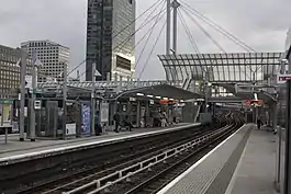 ![]() Platforms 2 and 3 at Poplar DLR station towards Lewisham, Stratford and Canary Wharf | |