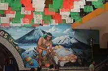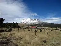 A different tale was told by the Nahuatl-speakers of Tetelcingo, Morelos,[5] according to whom Iztaccíhuatl was the wife of Popo, but Xinantécatl wanted her, and he and Popocatépetl hurled rocks at each other in anger. This was the genesis of the rocky mountain ranges of the continental divide and the Trans-Mexican volcanic belt that lie between the two mountains. Finally Popocatépetl, in a burst of rage, flung an enormous chunk of ice, decapitating the Nevado de Toluca. This is why the Nevado is flat-topped, with wide shoulders but no head. Conceivably this legend preserves the memory of catastrophic eruptions.[6]