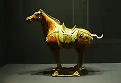As a great country of porcelain and ceramics, China has been making prominent and extraordinary achievements in this field. Whereas there is a huge system of porcelain industry in both Tang and Song dynasties, the representative achievements are the Tang Sancai (triple-colour ceramics) and the greatly developed porcelain styles respectively.[2] Tang is the most prosperous dynasty in history of China, in which one distinctive style ceramics Sancai is outstanding. Sancai is not only remarkable for its shape, decoration and glaze firing, but also for its artistic style—colourful and lively.[2] There are many colours such as yellow, auburn, green, white and navy used in the Sancai making, which reflects an open and flourishing culture in Tang and the pursuit of resplendence in aesthetics. Such an aesthetic are also revealed by the vivid shape of Sancai, which is shaped with regards of many aspects in reality, for instance, buildings, livestock, human figure, and daily items (plates, lights, pillows, bottles. etc.).[2] For example, the figures of horse are lively and natural for the smooth curves of the muscle of its legs and delicate saddle.