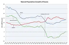 Between 1993 and 2008, there was a great decrease in the country's population from 148 to 143 million.[21] There was a huge 50% decrease in the number of births per year from 2.5 million in 1987 to 1.2 million since 1997, but the current 1.58 fertilty rate is still better than those of the 1990s.[21]