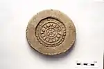 The inner courtyard held the main complex which consisted of a two-part central structure and two flanking galleries. The two buildings of the central structure, one behind the other, stood on square platforms which had been built up of clay layers and faced with bricks which were coated with lime plaster. The larger building was subdivided by wattle-and-daub panels into two halls and a series of smaller rooms. Walls and panels were covered with lime plaster which was painted with geometric designs and horizontal red stripes; the presence of two layers of plaster of different quality suggests repairs. The tiled roof had been supported by 36 wooden columns resting on stone bases. The building appeared to be of post-and-beam construction characteristic of Chinese Tang architecture; this is indicated by burnt timber fragments of interlocking wooden brackets in the Chinese style called dougong.[9] The decorative eave end-tiles recovered from the site are broadly analogous to those found in Tang contexts, however recent studies indicate they form part of a distinctive Uyghur stylistic typology.[10]