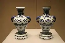 In the late Ming dynasty many kilns were manufactured which led the Ming economy.[3] The later emperors of the Ming dynasty like Jiajing and Wanli built more kilns in Jingdezhen.[4] There was more research on materials and techniques for the manufacture of porcelain during the Qing dynasty.[4] The high demand caused the Ming to realize that they needed to properly allocate and manage funds to establish a steady porcelain supply.[4] The additional kilns and management helped the production of porcelain and growth during the early Qing dynasty.[4] However, when the Ming Dynasty ended, suffering occurred during the Qing dynasty when Jingdezhen became a prime location for political turmoil and military campaigns during the Taiping Rebellion.[4] These invasions temporarily stalled the manufacture of porcelain.[4]