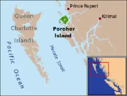 Porcher Island is an island in Hecate Strait, British Columbia, Canada, near the mouth of the Skeena River and southwest of the port city of Prince Rupert.[1] The locality of Porcher Island is located near the island's northern tip at Humpback Bay, 54°05′11″N 130°23′23″W.[2][3] Stephens and Prescott Islands are located off its northwestern tip.[4][5]