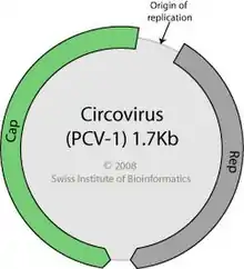 Porcine circovirus (PCV) is a group of four[1] single-stranded DNA viruses that are non-enveloped with an unsegmented circular genome. They are members of the genus Circovirus that can infect pigs.[2] The viral capsid is icosahedral and approximately 17 nm in diameter.