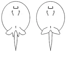 Almost circular in shape, it grows up to 40 cm (16 in) in disc width and 15 kg (33 lb) in weight.[3] The upper surface is covered with denticles (sharp tooth-like scales). The coloration is light brownish with mottled patterns on the dorso, and pink on the ventral side. As with all stingrays, the mouth and gill openings are on the underside, and the eyes and gills exits are on the dorsal side.