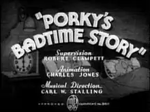 Porky's Badtime Story is a 1937 Warner Bros. Looney Tunes cartoon directed by Robert Clampett (his first short as director) and an uncredited Chuck Jones.[2] The short was released on July 24, 1937, and stars Porky Pig and Gabby Goat.[3] The short was later remade as Tick Tock Tuckered (1944), with Daffy Duck taking Gabby's role.