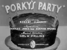 Porky's Party is a 1938 Warner Bros. Looney Tunes cartoon directed by Bob Clampett.[2] The short was released on June 25, 1938, and stars Porky Pig.[3]