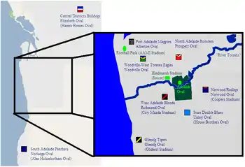 Talk of a side from South Australia entering the Victorian Football League (VFL) was fast-tracked in 1987 when a team from Western Australia, the West Coast Eagles, and a team from Brisbane, the Brisbane Bears joined the VFL. This left South Australia as the only mainland state in Australia without a team in an increasingly national competition. By 1989 seven out of ten SANFL clubs were recording losses and the combined income of the SANFL and West Australian Football League (WAFL) had dropped to 40% of the VFL.[4] During early 1990 the SANFL decided to wait three years before making any further decision in regards to fielding a South Australian side in the VFL until it could be done without negatively affecting football within the state. Frustrated with lack of progress, Port Adelaide held secret negotiations in the town of Quorn regarding entering the VFL in 1991.[5] From these discussions, Port Adelaide accepted an invitation from the VFL (which had since been renamed the Australian Football League). The AFL signed a heads of agreement with the club in expectation that Port would enter the competition in 1991, meaning the Port Adelaide Football Club would field two teams, one in the AFL and one in the SANFL. During the 1990 preseason Port Adelaide played a practice match against Geelong at Football Park in front of 35,000 spectators.[6] When the knowledge of Port Adelaide's negotiations to gain an AFL licence were made public, the rest of the SANFL and many other people across the state saw it as an act of treachery. SANFL clubs made an application to the Supreme Court of South Australia for an injunction against the bid, which Justice Olsson agreed to.[4] The AFL suggested to the SANFL that if they did not want Port Adelaide to join the AFL, they could put forward a counter bid to enter a composite South Australian side into the AFL. After legal action from all parties, the AFL finally agreed to accept the SANFL's bid and the Adelaide Football Club was born.[7]