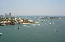 Port Everglades is composed of land within three municipalities, Hollywood, Fort Lauderdale and Dania Beach and unincorporated Broward County.[6] Port Everglades is a man-made seaport. The port was originally dredged from Lake Mabel, a natural body of water that was a wide and shallow section of the Florida East Coast Canal system. In 1911, the Florida Board of Trade passed a resolution that called for a deep-water port. The port was originally intended to ship produce to the North and the West. In 1913, the Fort Lauderdale Harbor Company was formed and eventually dug out the Lake Mabel Cut, which opened the New River to the sea and created access for small boats.[5]
